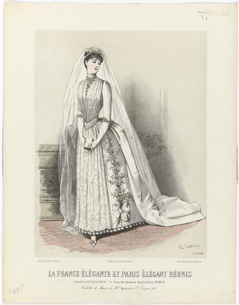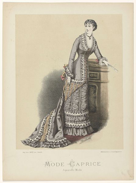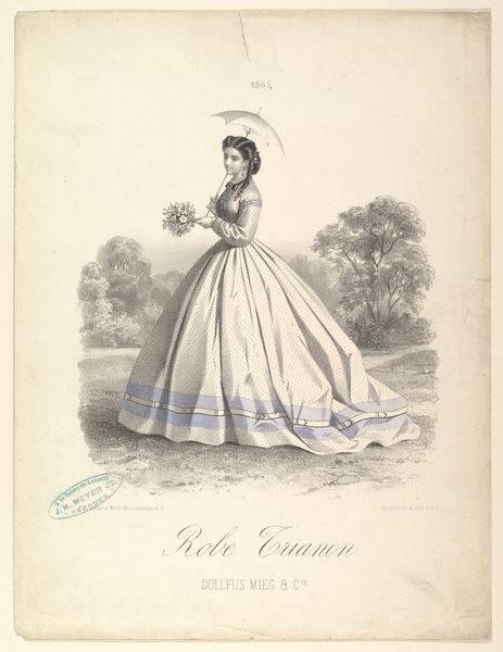 Editor: Here we have "Steinbach, Koechlin & Cie, 1867, No. 139: Mulhouse," created in 1867 by Lacour et Morin, using lithograph and mixed media on paper. The elegance of the woman's gown is striking, its form beautifully occupying the picture plane. What elements of its construction stand out to you? Curator: Note the strategic distribution of the ornamentation; curvilinear embellishments function as signifiers that simultaneously conceal and reveal the structure of the gown. The eye is invited to follow the rhythmic contours of the embellishments, tracing the geometry of the form. Observe how the lithographic process renders each detail with precision, constructing a visual narrative about fashion and its meticulous craftsmanship. Editor: The lines and shapes on the dress, especially those repeating looped patterns, feel very intentional. Is that part of the visual narrative you mention? Curator: Precisely. Those looping patterns create a semiotic play between rigidity and fluidity, hinting at the constraints and freedoms experienced by women during the time this image was made. How do these structural components – line, shape, and pattern – communicate a sense of elegance and societal expectations within the chosen media? Editor: The way the dress spreads out emphasizes space and volume. And now I'm considering how color enhances form and evokes mood… It feels so well balanced. Curator: Yes, the balance and arrangement, those inherent qualities of the image, manifest a self-referential system that speaks volumes about the principles of visual harmony. Considering that and how its design reflects a moment in time, what have you discovered about this piece's purpose? Editor: I see it as less about the person wearing it, and more about the artistry in the dress's construction. Thank you, I’ve learned to see beyond the surface representation and analyze its intrinsic artistic values.