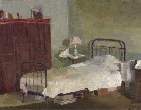 Grace Cossington Smith made this painting of a bedroom interior with oil on canvas, and it’s a great example of how painting isn't just about depicting a scene, but also about the pure joy of moving paint around. I find it so interesting how Smith uses color to build form, with small, square dabs of paint layered together. Look at how she renders the shadows with lavender and mauve. They create this feeling of warmth and enclosure, really capturing that feeling of being safe and cozy at bedtime. The way the light from the lamp bounces off the mirror and casts shadows on the wall, it’s almost like she’s painting a feeling as much as a place. It reminds me a little of Bonnard and Vuillard, those other painters of quiet, domestic interiors. It’s like she's saying that everyday life is full of beauty if you just take the time to really see it.