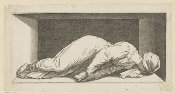 Johannes Wiedewelt created this drawing, "Nøgen foroverbøjet kvinde (beruset) med tømt vinkande", which translates to "Nude woman bending over (drunk) with empty wine jug," using pen and brown ink on paper. The choice of materials here is interesting because it brings a very intimate scene down to earth. This isn't some grand oil painting meant to elevate the subject. Instead, we see a quick sketch with simple tools, giving it an immediate feel. The brown ink creates a warm tone, almost like a sepia photograph, making the scene feel historical and personal at the same time. You can see the artist's hand in the varying line weights, some bold and confident, others light and tentative, especially in the shading around the figure. It’s a far cry from polished neoclassical sculpture, but this type of sketch was perfect for conveying the artist’s observations. The ease and relative low cost of the medium allows for a critical observation of human behavior, which is both comedic and pitiful. It reminds us that art doesn’t always need to be monumental to be meaningful; sometimes, it’s the small, direct observations that tell us the most.