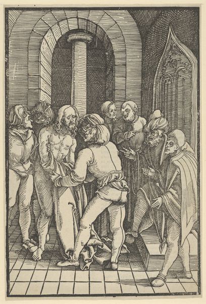 Editor: Okay, next up we have Albrecht Altdorfer's woodcut from 1513, "Christ Before Caiaphas, from The Fall and Redemption of Man," here at the Art Institute. It's... intense, almost claustrophobic. All that frantic energy packed into a tiny space. I wonder what the story is? What catches your eye when you look at this? Curator: What strikes me is the tension, wouldn’t you agree? Altdorfer uses the woodcut medium, its stark contrast, to amplify the drama. You see Christ, seemingly bowed under the weight of accusation. But then look at the dynamism of Caiaphas and his posse – almost leaping out of the picture plane. Tell me, does the northern renaissance setting change how you read the characters? Editor: That's a good point. I suppose I see it as a classic depiction, but the northern style gives it almost a folksy feel. It's less idealized than something from the Italian Renaissance. More human, maybe? The kind of guy in front raising his hands – what's he doing? Demanding an answer, pushing for a verdict? Curator: Precisely! Altdorfer isn't just illustrating a biblical scene; he's inviting us to witness a pivotal moment in history and perhaps reflect on its meaning in our own lives. It's an emotional plea using woodcut to draw us into its vortex of anger and sadness. Can we turn away, is that what the artist wants to us to consider? Editor: Yeah, I think so. He really brings it to life, making it less like some historical thing and more... timeless, maybe? That’s interesting – something made in the Renaissance can be very topical. Curator: Agreed. It’s as relevant now as it was then. Powerful stuff from a small piece of paper!