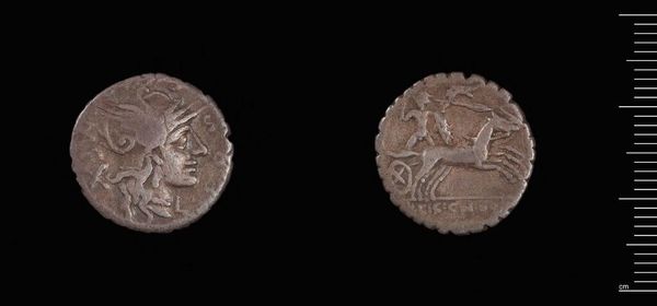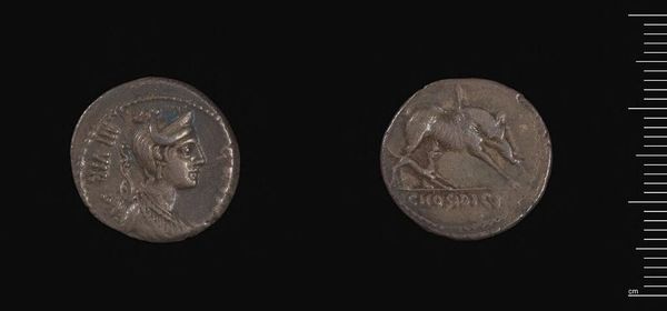 Editor: This is a Denarius of M. Aburius M.f. Geminus, a Roman coin. It's fascinating how something so small could have such economic power. What does its materiality tell us? Curator: This coin, like most, speaks volumes about Roman society. The choice of metal, the production process, and even the distribution reflect their complex economy and social structure. Editor: So, it's not just money, but a record of Roman labor and resources? Curator: Precisely. Consider the mining of the metal, the skill of the moneyer, and the systems required for circulation. This seemingly simple object embodies a vast network of material and social relations. Editor: That's incredible. I'll never look at a coin the same way again! Curator: Nor will I! The way that art has shifted to a place where we discuss the economics of art really shines through on this artifact.