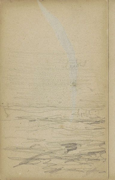 Editor: We’re looking at Johan Hendrik Weissenbruch’s "Zeegezicht," a pencil drawing on paper, dating between 1834 and 1903, housed here at the Rijksmuseum. The sketchiness makes it feel very immediate, like a fleeting impression captured quickly. What stands out to you in this piece? Curator: Well, beyond the immediate aesthetic, it’s interesting to consider Weissenbruch within the context of the Hague School. He aimed to capture the atmospheric conditions of the Dutch landscape, elevating the mundane to high art. How do you see this aim reflected in "Zeegezicht"? Editor: I guess it’s in the sketchiness - like the drawing feels so raw and unrefined, mirroring the ever-changing, unpredictable nature of the sea. Is there a socio-political element to that, like choosing ordinary subjects over grand historical themes? Curator: Absolutely. This shift reflects a broader movement away from academic art traditions towards realism and naturalism, often tied to emerging national identities and pride in the local. Instead of glorifying heroic events, artists turned their attention to the lives and landscapes of their nation. Do you notice any contrast between the dark strokes depicting a face at the upper-left of the image and the softer strokes to its right that show a human shape? Editor: I do. Maybe it is just an attempt to depict humans in multiple mediums. Curator: Good point, although it may reflect on the fact that artists turned to realism to depict humans in the Netherlands, there was a big gap in their rendering skills at that time. What do you make of it now? Editor: I now get a better understanding of this landscape in terms of its artistic background. Curator: Indeed, it's always enriching to consider how artworks respond to and shape their historical moment.