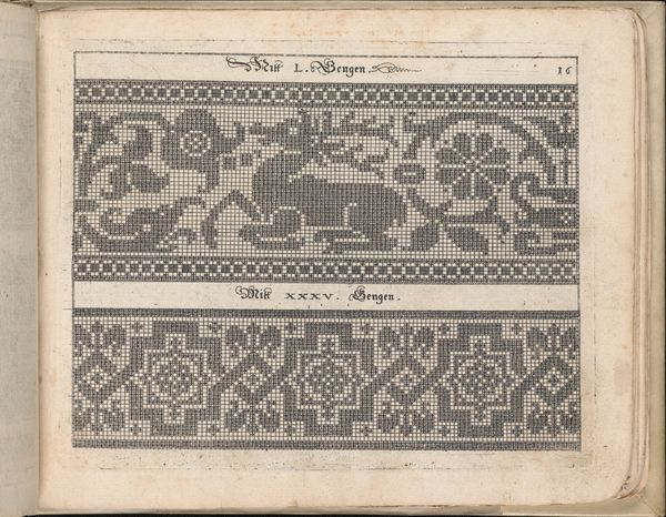 Curator: Here we have a page, specifically page 20r, from Johann Sibmacher’s "Newes Modelbuch in Kupffer," created in 1604. This book, now housed at the Metropolitan Museum of Art, exemplifies the ornamental printmaking of the Renaissance. Editor: My immediate impression is one of intricate precision. The density of the patterns and their geometric foundations suggest the detailed labor inherent in their creation, doesn't it? A kind of coded language emerges. Curator: Precisely. "Modelbuchs" like this were pattern books, tools for artisans – embroiderers, lacemakers, and other needleworkers - across Europe. They provided designs which would be replicated in textiles and other crafts. This book serves as a visual record of early modern aesthetic preferences. Editor: Absolutely. The grid is particularly striking. It feels almost like an early form of data visualization, reducing complex forms like that bird into digestible units. Do you see any deeper significance in the imagery beyond the ornamental? Curator: While their primary function was utilitarian, the imagery and symbols reflect the period's wider cultural preoccupations. Animals, geometric shapes—these were not simply decorative, but laden with symbolism in the early 17th century. The distribution and consumption of designs reflects power dynamics. Who had access to this knowledge? How did that shape gender and class? Editor: And it speaks to a pre-copyright world where cultural motifs circulated more freely, and interpretation and re-appropriation was perhaps valued over originality. These artisans are engaging in acts of imitation, creativity, and knowledge-sharing simultaneously. What impact would these designs have had across different socio-economic boundaries? Curator: A good question. By studying the adaptation of these patterns in different contexts, we can chart the cultural flows and transformations that occurred during the Renaissance, and also understand what limitations governed its access. Editor: For me, looking at this print, I see a complex interplay of art, craft, labor, and cultural exchange. A static object reveals these invisible structures when critically examined. Curator: Indeed. Sibmacher's "Modelbuch" is more than just a pattern book; it's a historical artifact reflecting the social and artistic landscape of its time. A fascinating reminder that even seemingly decorative objects hold profound insights.