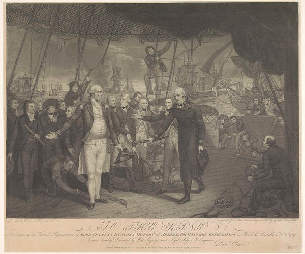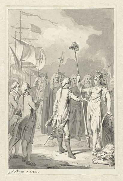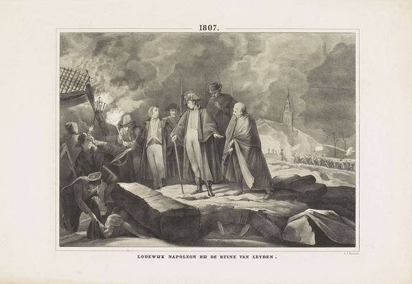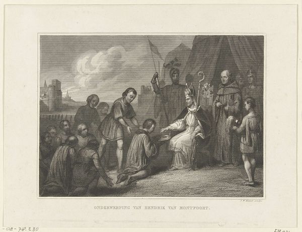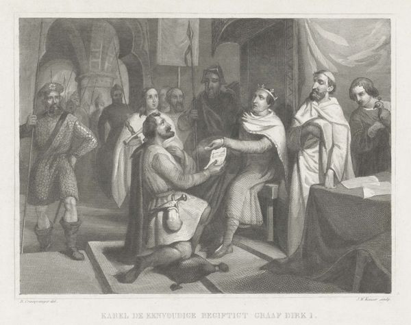 Editor: This print by Johann Wilhelm Kaiser, created between 1839 and 1841, depicts the meeting of Charles the Simple and Henry the Fowler in 921. There’s a real sense of staged formality to the whole composition. What symbolic reading might be drawn from such an event presented in this way? Curator: This piece is a powerful example of Romantic-era historicism. Consider how the artist uses specific symbolic elements to convey power dynamics and the significance of this meeting. What stands out to you in terms of symbols of authority or negotiation? Editor: The crowns are obvious, of course, but it seems more about gesture and placement. Charles is sort of descending here and there are subtle references to what feels like naval authority in the background. Curator: Precisely. Note how costume and setting – Charles, from the boat, is positioned lower, seemingly arriving or submitting - emphasize hierarchy, yet also the neutral space of parley, which speaks to negotiation. What emotional subtext do you infer from that tension? Does this encounter reflect well on Charles, or does it evoke some past grievance? Editor: It feels...delicate, as if any wrong move could trigger something unpleasant. It reminds me how symbols become loaded with meaning through historical context, and this piece highlights the careful dance of diplomacy. Curator: Indeed. And observe how Kaiser uses light and shadow to further accentuate the weight and drama of this royal rendezvous. The symbols carry the cultural memory, don't you think? Editor: Definitely. Looking at this scene, I’m now thinking about how historical events get re-imagined through art to reinforce cultural narratives.