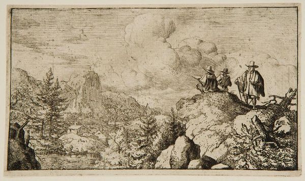 Editor: So, here we have Jacob Lutma's "Mountain Landscape with Wanderer and Donkey," created sometime between 1634 and 1654. It’s an etching, quite small and incredibly detailed. What strikes me is the labor involved in creating all those tiny lines. What can you tell me about it? Curator: Well, focusing on that labour, on the act of production, is key. Look closely at how the landscape is constructed, bit by bit, through the layering of lines. This isn’t just a picture of a mountain; it's an object created through very specific material practices. Think about the social context: who was producing prints like these, for whom, and under what conditions? Editor: So, you're saying the value is in understanding its production and consumption within that time? Curator: Precisely. Etchings like this were often reproduced and sold relatively cheaply, making them accessible to a wider audience than, say, an oil painting. But what kind of lifestyle can you deduce from such an intimate artwork? The level of detail, for instance, signals the degree of mastery Lutma acquired. But think further; how does the mode of reproduction influence how landscapes like this were consumed or understood by the viewer? Editor: I see what you mean. Knowing it was more widely accessible makes me reconsider the idea of the solitary wanderer. It's like, this scene is brought into your home... available for personal consumption! Curator: Exactly! Consider, too, the materiality of the print itself—the paper, the ink, the marks left by the etching tool. The ‘high art’ image comes from everyday production, through these humble means. What would this landscape represent as an object of commerce versus aesthetic representation? Editor: So interesting. I guess I was too focused on the "art" part and missed the material realities behind it. Curator: Often, the material reality informs our interpretation. It’s always more complicated and interwoven. It’s that tension, that space between high and low, art and craft, which really animates these works for me.
