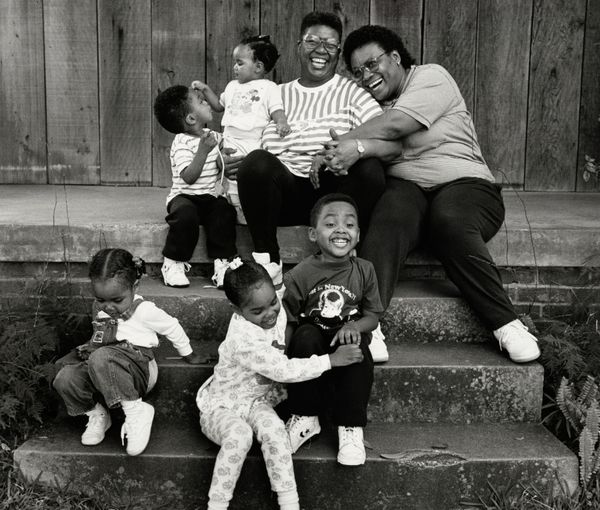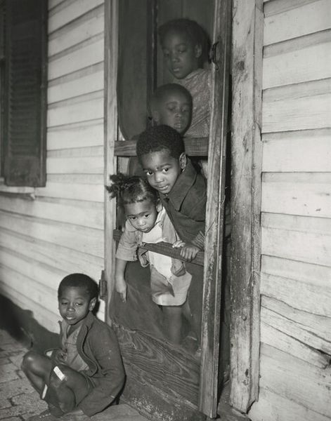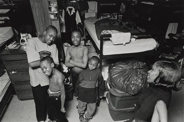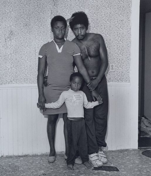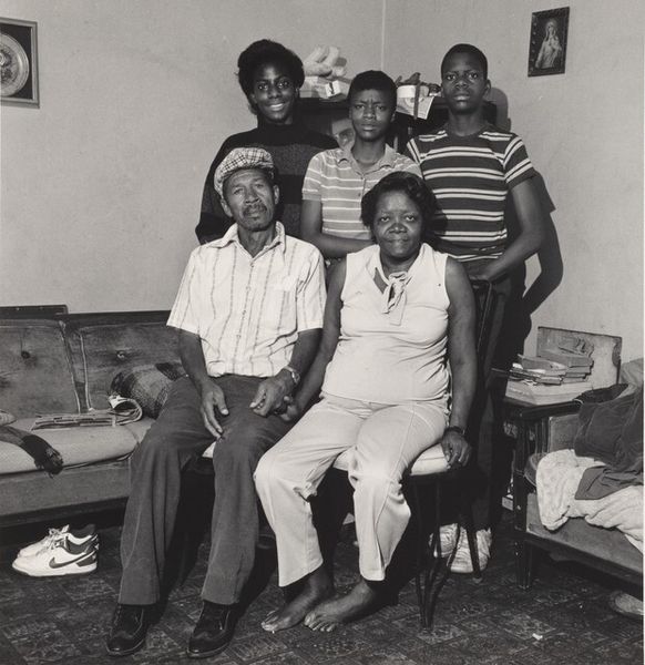 Curator: This compelling gelatin silver print is by Milton Rogovin, titled "Hubert Morrison with Family, Atlas Steel," part of his "Working People" series from 1978. What strikes you first? Editor: Wow, the sheer number of people! It feels so full, overflowing almost, but their faces have a beautiful calm. It’s a strong, united presence radiating from the print. Curator: Absolutely. Rogovin dedicated his work to documenting marginalized communities, focusing on the dignity and resilience of working-class families like the Morrisons. His project actively countered prevalent racist stereotypes and shed light on lived experiences frequently omitted from mainstream narratives. Editor: I see that. You can sense that immediate bond and trust. Their postures are so open, faces direct, confronting yet vulnerable at the same time. It’s so simple and raw. Makes you want to learn their names, their stories. Curator: Rogovin’s socialist and humanist convictions deeply influenced his method, aiming to empower his subjects through representation. Consider, too, the historical backdrop. 1978 – a period of deindustrialization, rising unemployment in places like Buffalo where he lived. The title grounds the photograph explicitly to these economic realities. Editor: I can’t imagine that work was easy. Steel? It has got to take a certain type of resilience. There's almost a collective burden and exhaustion in some eyes, but yeah, a lot of pride, too. Do you think the black and white enhances this sense? Curator: I think it’s intrinsic. Black and white emphasizes the tonal range of human experience: shadows and light. It also carries an unmistakable documentary gravitas. But beyond its aesthetic appeal, the format firmly locates the photo within a rich history of socially conscious photography. Editor: Thinking about them, Hubert and his family... I hope they know the power their portrait has now, that someone cared to tell their story in that specific moment of American life. It has really stuck with me. Curator: Agreed. Rogovin offered a powerful form of social commentary by enshrining the lives of ordinary people against backdrops of massive economic change. It pushes viewers like us to confront social inequality and recognize the universal dignity in every individual.