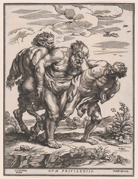 Editor: Here we have "Hercules and Antaeus," a drawing, print, and engraving created in 1852 by Eugène Delacroix, now residing at the Metropolitan Museum of Art. My initial impression is one of violent tension – the two figures are locked in such a close embrace that it almost feels suffocating. What do you make of this depiction? Curator: Ah, Delacroix! Never one to shy away from a good brawl, either on canvas or in the streets of Paris, I reckon. What grabs me is the raw, untamed energy – you can almost hear their grunts and the tearing of fabric. Notice how he uses line – all frantic, scratchy energy – to create this feeling of intense struggle. It is less about classical perfection and more about conveying raw, emotional power, right? Editor: Absolutely! The frantic lines create a real sense of movement. It looks almost sketch-like in its intensity, yet it still clearly depicts the musculature and form. Curator: Precisely. And don’t overlook the story itself. Antaeus was a giant who drew his strength from the earth. Hercules, realizing this, lifts him into the air to sap his power. The anguished, contorted form of Antaeus says it all. It makes you wonder, what does it mean to lose connection to one's source, one's grounding? Does our strength inherently derive from a greater context than ourselves? Editor: I see what you mean. The figure on the ground seems to mirror that loss, maybe representing Antaeus's mother, Gaia, the Earth? Curator: A thoughtful observation. Delacroix often explored these tensions between the human and the elemental, the earthly and the divine. How fascinating it is to contemplate which forces guide us and determine our trajectory. What do we take away? Perhaps it's that we are more vulnerable when divorced from our roots? Editor: That’s a compelling interpretation. Delacroix certainly provides plenty to ponder, a dance between dynamic violence and meaningful narrative. Thank you.
