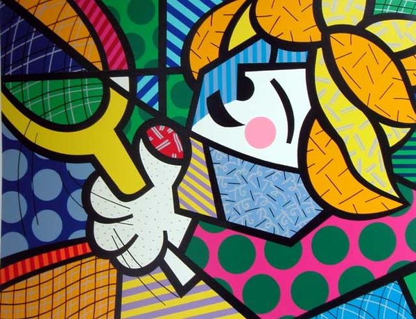 Editor: So, this print is "Doraemon; Here We Go!" by Takashi Murakami, from 2018. It's visually so vibrant, packed with imagery! I’m curious, what are your thoughts on how Murakami uses materiality to convey meaning here? Curator: Considering a materialist lens, it's crucial to acknowledge the reproductive aspect of printmaking in "Doraemon; Here We Go!". The print, using acrylic paint, immediately removes the aura of uniqueness. Note how it embraces accessible imagery from mass media; the very process comments on consumer culture. Doesn’t the utilization of such materials challenge the established boundaries between fine art and commodity? Editor: That's a fascinating point! I hadn't really thought about the choice of print itself as a statement. It makes sense though, since it directly involves reproducibility, unlike painting, for instance. Curator: Precisely! Also, observe the almost industrial precision in his technique. Despite being "handmade," his works utilize industrial strategies, thus minimizing direct input. The layering, how controlled, it presents, challenges traditional definitions of the artist's hand. To what extent is it still handmade art, if we focus solely on production means? Editor: I guess it highlights the artistic idea and its mechanical reproduction being almost of equal significance... rather than necessarily the 'touch' of the artist. Thinking about it now, Murakami also made sure these prints are accessible in galleries worldwide... Curator: Precisely. That reinforces the artwork's context of consumption. Instead of mere aesthetic enjoyment, its real message lies in highlighting how art is also an economic venture involving materiality. Editor: So interesting! I see how a seemingly straightforward image carries intricate ideas about production. Thank you for your perspective!