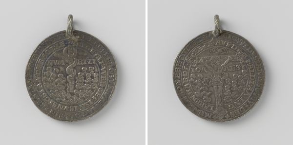 Editor: Here we have a fascinating object: a metal guild badge from 1750 given to Willem Cornelis Ackerdyck by the Schippersgilde, or Boatmen's Guild, of 's-Hertogenbosch. It’s fascinating that we can see two sides in this image! On one side is an engraved depiction of a sailing vessel, while the other shows an elaborate coat of arms. What structural elements jump out to you in this artwork? Curator: Notice how the circular form dominates the entire composition. The artist strategically uses the tondo shape to enclose the imagery. Furthermore, both sides, though distinct in iconography, are unified by the circular border text and ornamental elements, creating visual harmony. Have you also observed the shallow relief, typical of engraving, and how that impacts the piece's tactile quality? Editor: I did. It's amazing how much detail they were able to achieve despite the limited depth of field! How does the Baroque style influence the medal's overall presence? Curator: The Baroque influence is evident in the dynamic composition on the coat-of-arms side: notice the two figures framing it and how their bodies curve around it. Moreover, there's a tension created between the flat, planar surface and the attempt to render three-dimensional forms. It evokes depth despite its technical limitations. Doesn't it strike you that way? Editor: Definitely, I can appreciate it more now. I’m curious: Does the symmetry contribute to a sense of formal balance, considering the Baroque aesthetic often favored dynamism? Curator: An astute observation. Yes, it presents a controlled Baroque style. The symmetry on the coat-of-arms side definitely tempers any overwhelming dynamism, offering a composed, dignified representation appropriate for a token of honor within the guild. The placement of lettering around the perimeter reinforces the idea of completeness and cyclical recognition. Editor: Thank you. It is fascinating how looking at its structure reveals a new level of detail and intention. Curator: Indeed, art offers much when viewed with an eye toward its inherent structure and qualities.