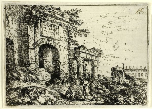 Here is Johannes or Lucas van Doetechum’s etching, "Gezicht op de Sint Pieter in Rome". The image shows an ancient Roman structure, perhaps part of the original St. Peter's Basilica. It's all rendered in precise, delicate lines. The contrast between the ruined architecture and the human figures creates an emotional tension. The composition is organized around a series of arches and walls, and these architectural forms create a dialogue between geometric order and natural decay. The detailed rendering of each brick, shadow, and plant invites a semiotic reading of the artwork. The image contrasts the permanence of stone with the fleeting presence of human life. This structure reflects themes of time, memory, and the transformation of cultural symbols. This architectural view is not just a visual document but a philosophical statement about history and the human condition.