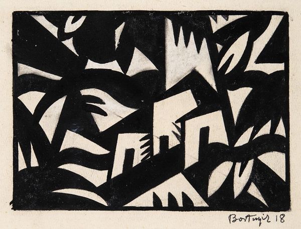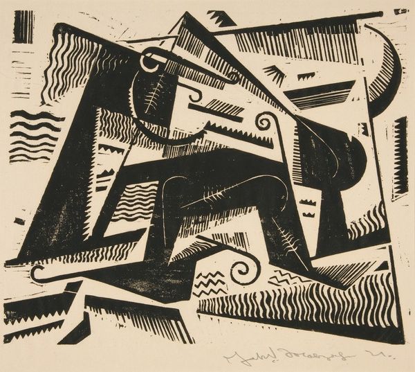 Hugh Mesibov created "The Dictators", a stark woodcut, its dense blacks and whites immediately commanding our attention. Sharp, angular forms dominate the composition, creating a fragmented, uneasy space. The visual language here borders on the surreal. We see distorted figures and abstract shapes, creating a sense of chaos and unease. The high contrast amplifies the emotional impact, forcing the viewer to confront the starkness of the scene. Mesibov uses a semiotic system of signs, where simplified forms represent complex ideas and power structures, revealing the broken order of the world. Note how Mesibov disrupts conventional modes of representation. The distorted perspective and unsettling forms challenge fixed meanings, asking us to question the stability of the world around us. "The Dictators" thus becomes more than a depiction of political figures, it is a visual inquiry into the nature of power and its impact on the human condition.