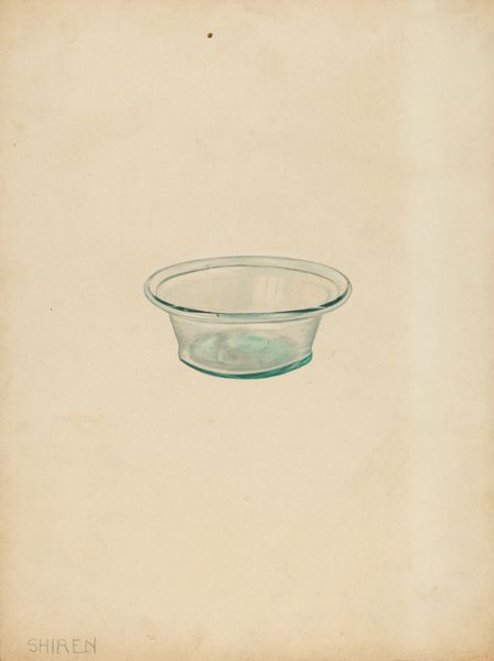 Editor: So, this is "Bowl," a watercolor drawing from sometime between 1935 and 1942 by Nicholas Amantea. It feels almost… archaeological in its simplicity. Just this single vessel, centered. What strikes you most about it? Curator: I'm drawn to how everyday objects become imbued with symbolic weight over time. This bowl, rendered with such care, transcends its function. The bowl is a vessel, of course, suggestive of containment, nurture, perhaps even memory. Consider how bowls appear across cultures - are there shared visual attributes or ritualistic roles across them? Editor: That’s fascinating. It makes me think of things like baptismal fonts. Is that why it’s rendered with so much light and detail, because it is meant to symbolize something beyond the object itself? Curator: Precisely. The translucent watercolor lends a sense of ethereality, almost as if the bowl is filled with light rather than substance. Think about the colors used here – they aren't just descriptive. Light blue often implies calmness, peace, sometimes even divinity in different symbol systems. Editor: I never really thought about an object like a bowl carrying so much significance. Curator: It also prompts reflection on domesticity, routine, the simple acts of providing and receiving. What we choose to depict, and how, always carries cultural memory and aspirations. It isn't just a bowl; it's a testament to something lasting. Editor: I'm definitely looking at everyday objects differently now. Curator: Exactly! The most humble thing, when framed right, can reveal incredible depths.