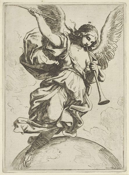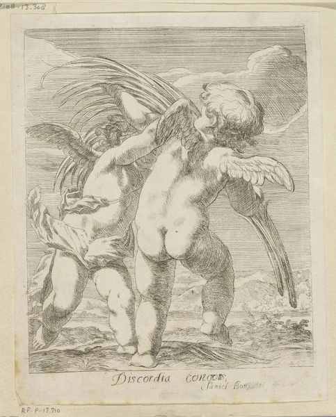 Curator: This engraving by Anton van der Borcht, created sometime between 1648 and 1663, depicts "Cupid Riding a Dolphin." The scene bursts with a sort of... well, a playful tension. Editor: Playful? At first glance, I sense more dominance than play. Look at the contrast. A tiny Cupid, poised with bow and arrow, asserts himself over this massive, almost comical dolphin. It suggests mastery, power… something beyond mere childish fun. Curator: Absolutely! The Baroque loved a bit of drama. Think of Cupid as a tiny god wielding enormous power. The dolphin beneath isn't just a sea creature; it symbolizes navigation and guidance. Cupid subverts that, steers the ship – or rather, the sea – towards love’s chaotic, irrational destinations. Editor: Precisely. Semiotically, we could read the dolphin as a suppressed libido, dominated by Cupid’s rationalized, formalized 'love.' Notice the detail in the engraving: the meticulous rendering of the dolphin’s scales versus the almost idealized, smooth texture of Cupid's skin. This disparity reinforces the theme of subjugation, wouldn’t you agree? Curator: Subjugation maybe. But in the throes of love, isn't there always someone steering, or dreaming of steering? The engraving style itself lends something dreamlike to it. And in fairness, perhaps the dolphin actually *likes* giving Cupid a lift? Maybe it sees him as a little beacon? Editor: You inject too much sentiment. While individual interpretation is always relevant, formally speaking, the arrow’s directedness implies control, not consent. Further, it's a masterful engraving: a display of line quality. Note how Borcht uses the density of the lines to describe not just shape, but also mood. See how different linear textures affect the atmosphere so vividly? Curator: That dense linework gives a sense of depth to something that would feel static if it was not handled with such delicacy and imagination. It makes me feel as though everything is on the move; a Baroque masterclass in controlled chaos. Editor: Well articulated. It showcases, indeed, how close observation and astute visual choices render complex allegorical themes accessible through structured form. Curator: True; and perhaps it is in that balance between controlled lines and implied emotion that it still resonates with our chaotic little hearts today.