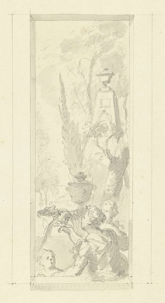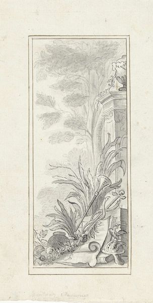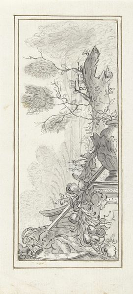 Abraham Meertens made this design for a room decoration with pen in gray around the late 18th century. The image presents a panel with birds set within a neoclassical framework. This drawing exemplifies the decorative arts prevalent in Europe at the time. The juxtaposition of classical elements, like the shield and spears, with naturalistic motifs such as birds, trees, and foliage, reflects the period's interest in reconciling classical ideals with natural forms. Made in the Netherlands, the design reflects the prevailing social and cultural values of the time. The Dutch Republic, known for its mercantile power and sophisticated urban culture, embraced the arts as a symbol of status and refinement. Interior decoration played a crucial role in expressing social standing and taste. Further research into the Dutch decorative arts of the 1700s can provide additional insights into the historical and cultural context of Meertens's design.