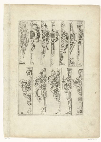 This 17th-century engraving by Gabriel Kramer presents a series of balusters and terms, showcasing the artistic and architectural interests of the period. Note the prominent use of the Ionic order, identifiable by the volutes—those scroll-like ornaments atop the columns, symbolizing wisdom and contemplation since ancient Greece. The recurrence of human figures integrated into the architectural elements draws our attention. These 'terms,' or herms, figures emerging from pillars, have roots in ancient Greece, where they were associated with Hermes, the messenger god, serving as boundary markers and protectors. We observe a dance of forms, from the fluted columns to the grotesque masks—echoing motifs found in ancient Roman art—symbols of protection that were meant to ward off evil spirits. The rhythmic repetition of these motifs, along with the play of light and shadow, evoke a sense of harmony but also a deeper, subconscious connection to ancestral beliefs and the ongoing dialogue between humanity and the cosmos. These images live through time, re-emerging in new contexts.