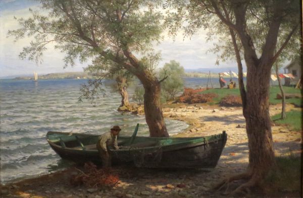 Curator: Standing before us is "Fra Kristianiafjorden" by Hans Gude, an oil on canvas. This work exemplifies plein-air painting, with Gude capturing the light and atmosphere of the Kristianiafjord. Editor: Wow, it’s funny; it makes me feel…nostalgic for a time I never knew. Look at the way the light catches on that sail and the stillness of the water; so quiet and contemplative. I find myself wondering about the story within that little boat, the subtle details, the person perhaps contemplating life's vastness, or simply enjoying the peace of the landscape. Curator: Precisely. The composition divides rather distinctly into foreground and background, foreground featuring beached boats and various shoreside materials. Note how the artist's meticulous attention to light plays a critical role in the tonal modulation of forms across the surface of the work. The brushstrokes exhibit an interesting interplay between capturing detail and maintaining a cohesive visual field. Editor: The tonal quality really nails that northern light—it's gentle but sharp. The artist isn’t trying to oversell the scene. You feel the gritty sand and hear the seagulls even! It’s like peeking through a window into a past moment. Also I love the structural elements. That sailboat acts as the anchor of all the composition. Curator: Yes, the structural integrity cannot be denied. The strategic placement of elements—boats, figures, buildings—all contribute to the overall sense of balance. Gude employs atmospheric perspective adeptly, creating depth and distance through subtle shifts in colour and clarity. Editor: Ultimately, Gude captures more than just a visual scene; it’s more profound—almost as if it's reaching towards an understanding of humanity's connection to nature. Curator: A compelling notion. And a potent reminder of landscape's enduring capacity to resonate across time. Editor: Indeed; so evocative. What a gem of a painting!