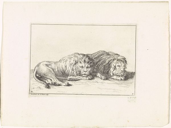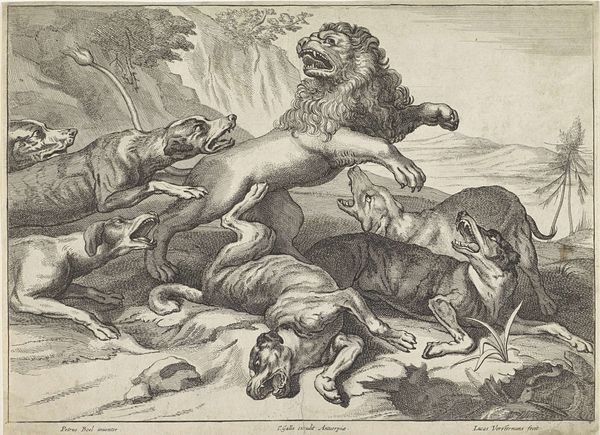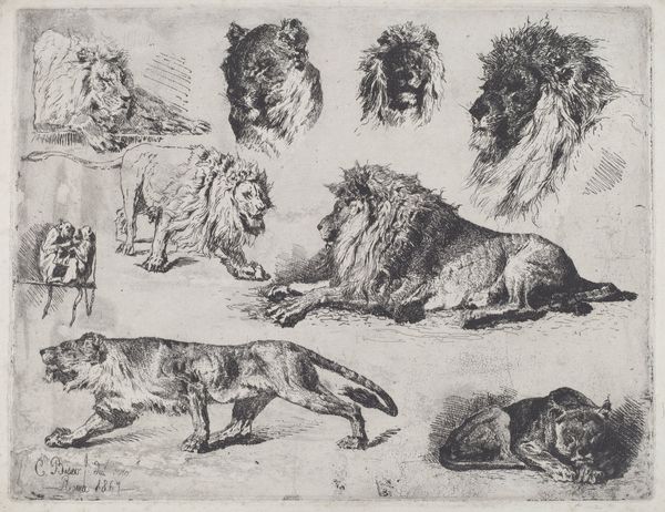 Wenceslaus Hollar created this print, "Six Lions in Various Poses," using etching. The composition immediately strikes us with its arrangement of lions, some confrontational, others seemingly at rest, filling the frame with dynamic energy. Hollar masterfully uses line and texture to differentiate each lion's pose and emotional state. Consider the lion on the left, its back turned, a study in dense, cross-hatched lines, suggesting weight and mass. In contrast, the roaring lion displays looser, more frantic lines, evoking raw power. This variation in technique gives each lion its distinct presence and character. The print offers a semiotic exploration of the lion as a cultural symbol. Traditionally representing strength and nobility, Hollar complicates this reading by presenting the lions in a range of attitudes. This challenges any singular interpretation and invites us to consider the multifaceted nature of symbolic representation itself. The way Hollar uses the etching technique itself contributes to the symbolic weight of the work. The stark contrast between the black lines and white paper emphasizes the raw, unfiltered nature of the animal, stripping away any romanticism. It's a powerful, visceral statement about the essence of the animal, inviting ongoing interpretations.