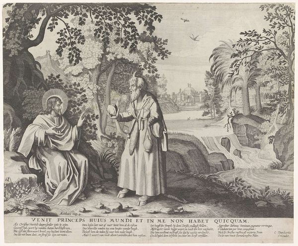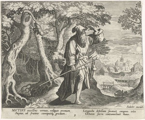 Curator: This is an engraving created sometime between 1583 and 1588, attributed to Johann Sadeler I. It’s titled "Paphnutius as a Hermit." Editor: It's immediately striking; a cloaked figure emerging from the woods feels both isolated and imposing. There's an intense amount of detail, and almost stark light and shadow across the whole plate. Curator: The subject is Paphnutius, a historical figure who renounced public life to live as a hermit. What’s intriguing is that the artist situated him not in a barren wilderness, but in a landscape with hints of civilization like the figures in the distance who appear to be burdened by the weight that they bear, or even the clear sight of the houses and church on the left, next to the small lake or swamp. Editor: It almost creates a juxtaposition. Paphnutius seemingly turns his back on industry and labor, embodied by the line of burdened workers, for a life centered on faith and introspection, while remaining very close to town, the sounds of working people, the church and its rhythms of the religious calender, the need for food. This wasn't the isolation we tend to expect from Hermits. Do we know what materials he had access to for this piece? What type of ink and paper did the artist use? Curator: Sadeler was known for his skill in capturing fine details through engraving; his prints circulated widely, contributing to the dissemination of religious and allegorical ideas throughout Europe. These prints allowed for wide audiences to learn about religious ideas they may have not been able to read about themselves, while potentially even inspiring people who otherwise wouldn’t have become monks, clergy or religious in the way depicted in the engraving. Editor: Considering this, it raises some questions about accessibility. It also complicates Paphnutius’ choice; we see how engravers made it more available for many audiences through careful labor. This highlights the complex relationships of work in our day-to-day reality, including both spiritual and artisanal making, production and use, that continue to hold sway centuries later. Curator: Absolutely, viewing art through multiple lenses enhances its significance and invites reflection on themes that resonate even today. Editor: I find this piece incredibly captivating because of its layered commentary, while remaining open to my own interpretation that allows for some appreciation and admiration of the artists' craft.