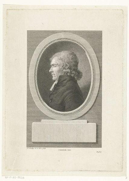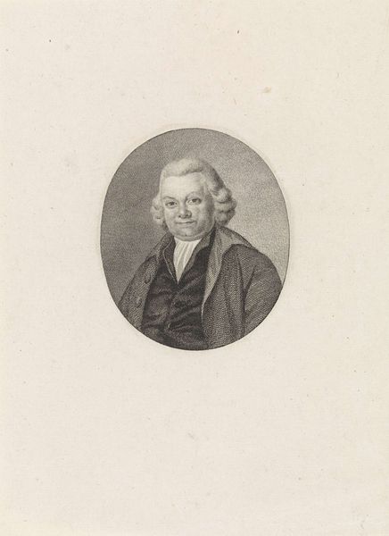 Editor: Here we have "Portret van Koenraad Hovens" by Reinier Vinkeles, made between 1786 and 1809. It’s an engraving. It strikes me as a rather formal portrait, almost severe, framed in this simple oval. What do you see in it? Curator: Oh, but I find a quiet strength there, don't you think? Look at the eyes – that steady gaze. It feels like peering into a particular moment in the Dutch Enlightenment, all captured within this perfectly etched little world. I like to imagine Vinkeles and Hovens deep in discussion – perhaps about natural philosophy or even radical politics! Do you get a sense of that at all? Editor: I hadn’t considered the Enlightenment aspect! I was too focused on the technique itself – the precision of the lines, the almost photographic quality of the engraving, and perhaps on the individual more than the context. I was also caught on what seem like inconsistencies in the date? Curator: Good point! It suggests a process, maybe even that Vinkeles worked on this portrait off and on over that timeframe. It certainly wasn't a snapshot! It’s like capturing a lifespan in one frame, and I think the slight Baroque style plays with it to enhance it all... doesn't it tickle you somehow? Editor: It does now! Seeing it as part of that intellectual moment definitely changes the mood. Thanks. Curator: It just goes to show that even the most seemingly straightforward portrait can become a window into a whole world! What a gift isn't it? Editor: Indeed! Thanks for illuminating that for me! I have to confess this might just be my favourite stop today. Curator: Mine too. Now, onto the next spark, eh?