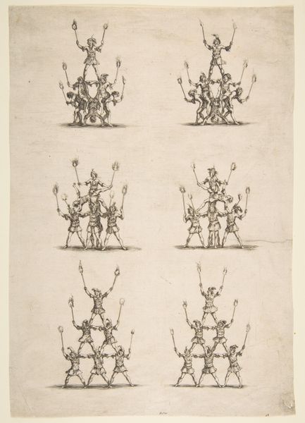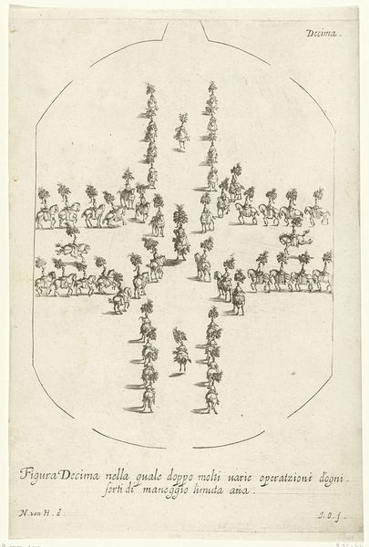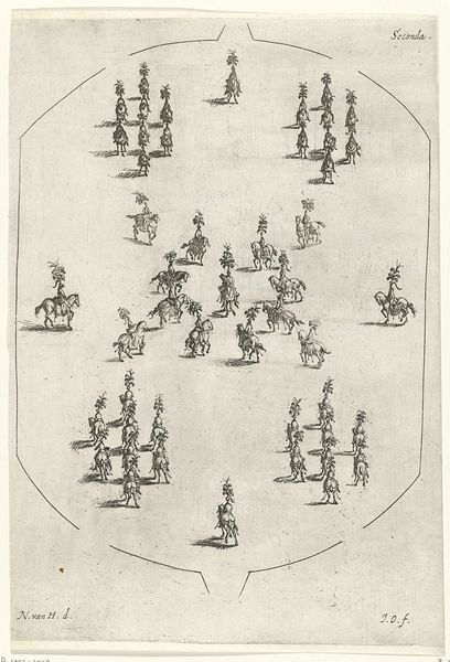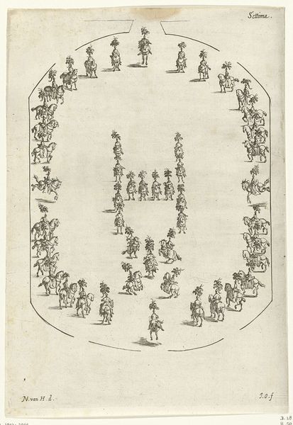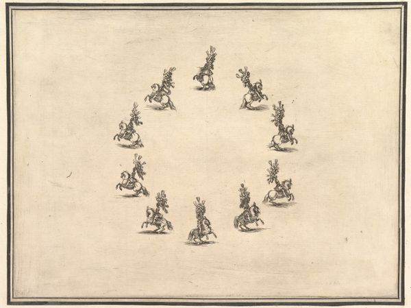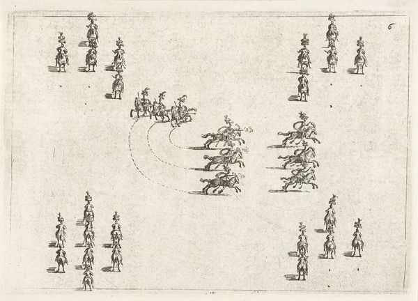 Nikolaas van Hoy made this print, Groepen ruiters in beweging, using etching sometime in the 17th century. It depicts groups of horse riders in motion in a minimalist manner. The etching process is key here. By incising lines into a metal plate, inking it, and then pressing it onto paper, Hoy was able to create multiple copies of this image. While these prints were often seen as lesser than painting, the printmaking medium allowed for a wider distribution of images, enabling access to art beyond the elite circles of society. The marks and lines that compose the artwork are not accidental, they are deliberate strokes that contribute to the overall composition. By making use of the printmaking technology, Hoy was able to democratize art, moving it away from unique artworks, and closer to mass production. He offers a glimpse into the changing landscape of art and labor in the 17th century.