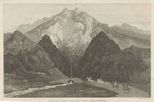 Curator: Salomon Gessner, born in 1730, presents us with "Near Flüelen," a landscape view now residing at the Harvard Art Museums. Editor: Stark contrasts dominate; look at how the light carves out the mountain folds, emphasizing their monumentality against the stillness of the water. Curator: Gessner, though known as a poet, also explored the picturesque through prints like this, catering to the burgeoning Romantic sensibility and its longing for unspoiled nature. Editor: Indeed, this piece captures that longing; the eye is led into a serene, almost mythical, distance. It's a sublime composition. Curator: And it's within these idealized views that we see the seeds of later environmental consciousness—a desire to preserve these 'unspoiled' vistas for future generations. Editor: It's a testament to the power of visual language; these lines and forms evoke a powerful sense of both awe and tranquility.