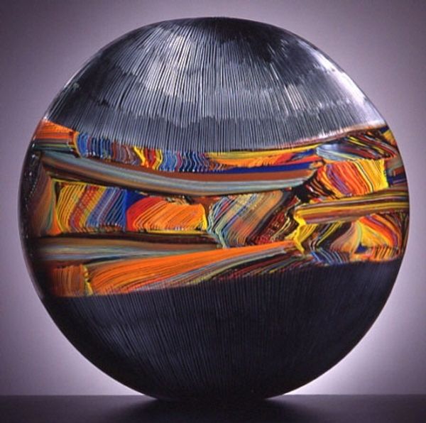 Editor: This arresting artwork is "Coinbra" by Lino Tagliapietra, created from glass. I am mesmerized by its unusual form and the striking interplay of colors! What's your take on this intriguing piece? Curator: This is a stunning example of contemporary glass art, indeed. It’s interesting to consider how Tagliapietra, trained in the Murano tradition, subverts and transforms that history. Think about Murano glass's long association with ornate, decorative objects favored by the elite. How does "Coinbra" challenge that perception of glass as purely ornamental? Editor: I see what you mean! It’s less about embellishment and more about pure form and color. Curator: Exactly. Its abstraction is almost like a three-dimensional color field painting, breaking away from traditional forms. Its biomorphic shape evokes natural forms, but rendered in intensely artificial hues, which plays with our expectations of art's relationship with the natural world. And consider how its presentation in a museum or gallery space elevates it, granting it a status far removed from its material origins. Editor: That tension between the natural and artificial is fascinating. So, it’s the institutional context that really shapes how we value it? Curator: In part, yes. The context informs our understanding and appreciation of the work. The political statement emerges through that tension. Think of how this piece makes us reconsider what we define as ‘art’ and who gets to decide that. Editor: I'm beginning to appreciate this sculpture's complexities in a whole new light now. It seems so much more than just a beautiful object. Curator: Precisely! Understanding its cultural and historical context is crucial to unlock its layers of meaning.