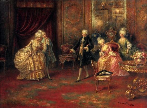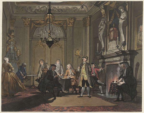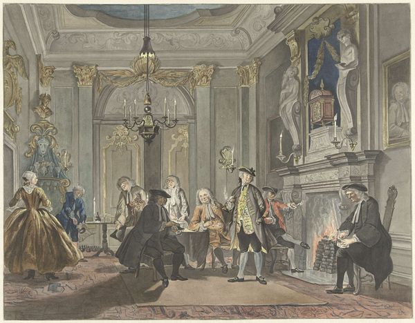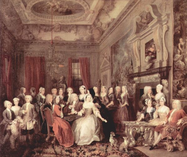 William Hogarth created "The Children's Theater In The House Of John Conduit" using oil on canvas, a traditional choice for his era. Yet, the conventional materials serve an unconventional purpose here: capturing the theatricals of the upper class. Hogarth masterfully uses the fluid properties of oil paint to depict the lavish fabrics of the children's costumes, the polished surfaces of the grand interior, and the overall sense of opulence. The brushstrokes are precise yet lively, giving the scene a dynamic, almost performative quality. Consider the labor involved in staging such an event, from the seamstresses crafting the elaborate garments to the servants maintaining the Conduit household. Hogarth implicates the performance of class through careful orchestration of these elements, blurring the lines between the world of fine art and the material conditions of 18th-century society. Through this lens, the painting challenges us to look beyond its surface and recognize the complex interplay between artistic skill, social status, and the often-invisible labor that underpins it all.