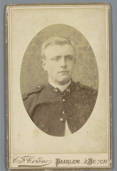 Editor: Here we have Franz Reissig's "Portret van een man in een militair uniform," a gelatin silver print dating from around 1883-1895. I'm struck by the texture of the print itself, that creamy, almost tactile surface. What aspects of this portrait draw your eye? Curator: For me, it's the photograph’s function as a commodity that stands out. It’s not just an image; it’s an object produced and consumed. Think about the materials themselves—the silver, the gelatin, the paper—and the labor involved in their extraction, refinement, and ultimately, their assembly into this framed portrait. It speaks volumes about the industrialization of image-making in the late 19th century. Editor: So, beyond the individual depicted, you’re interested in the broader system that allowed this portrait to exist? Curator: Exactly! Consider the military uniform too. It's a fabricated thing, assembled from textiles, metal, and thread. Its purpose goes far beyond simple function and comfort; it's all about imposing power and displaying rank through visual cues and markers that solidify social stratifications. This then has the intended effect of inspiring discipline and control, where photographic portraits, affordable to some at this point, were integral parts of the larger industrial-military complex. Editor: It's like the photograph captures not just a person, but an entire mode of production! Curator: Precisely. What does analyzing it in terms of material and labor uncover, compared to simply interpreting the sitter’s psychology? What does it reveal about photographic materiality and military culture? Editor: I never considered how much the means of production shaped the portrait's message itself. It pushes me to think about art as more than just an isolated creative act. Curator: Indeed, thinking about the materials and context surrounding an artwork lets us understand its role in a much larger world.