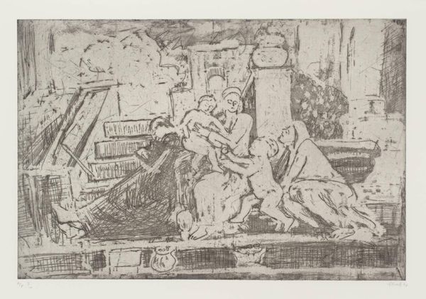 Curator: "Chinese Lakwerkers," made sometime between 1682 and 1711 by Pieter Schenk. It’s a striking engraving, here at the Rijksmuseum. Editor: Immediately, the stark contrast captures my attention. The black lines carving out these figures… there's a precision and, oddly, a kind of austere elegance. Curator: Indeed, Schenk has managed to condense a lot into a small space. Beyond the technique, the subject is what really interests me. It presents an interpretation of Chinese artisans, working, presumably, on lacquerware. But consider what this image is meant to convey to its contemporary European audience. It evokes this 'distant other,' playing on prevalent notions about Eastern cultures. Editor: And we can see that orientalism so clearly in the visual language: the exotic architectural details, the costumes. Even the stylization of the figures seems intended to reinforce a sense of difference. Looking at the man kneeling... the lines create almost decorative folds in his clothing, reducing the figure to pattern. Curator: Precisely! It's not necessarily about accuracy. Think about the cultural exchange, or, rather, the power dynamics at play when Europeans created images representing people of other nations. There’s also the impact on the Western psyche: were these images contributing to existing fantasies? Were they promoting trade, colonialism? Or were they simply trying to bring "the outside in", like novelties for wealthy merchant houses? Editor: From a formal perspective, observe how Schenk uses line weight to suggest depth. The foreground figures are more boldly defined, while those further back seem to fade, reinforcing the perspective. What initially appears as a simple, almost primitive etching, reveals a sophisticated understanding of spatial construction when studied closely. Curator: The piece acts like a small window into a moment in time – a mirror reflecting both the reality and the skewed perceptions of a bygone era. Editor: A fascinating dance between representation and interpretation, and a study in contrasts beyond the obvious black and white.