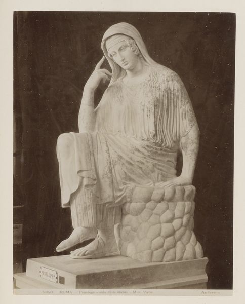 Editor: Here we have a photo of Eugene-Antoine Aizelin's marble sculpture, "Mignon," residing in the Ny Carlsberg Glyptotek in Copenhagen, taken sometime after 1903. I find the statue incredibly melancholic, she is such a lovely form, but burdened. What are your thoughts when you look at it? Curator: That sense of melancholic beauty is precisely what made these types of sculptures so popular in the late 19th and early 20th centuries. Think about the role museums played then - places of civic pride and displays of cultural achievement, but also sites where narratives of ideal beauty and even tragic heroism were presented to the public. Consider the subject "Mignon," a character from Goethe's "Wilhelm Meister's Apprenticeship." How does choosing a literary figure affect its public role? Editor: That's a fascinating connection! It reframes the sculpture; it’s no longer just about beauty but also about invoking this cultural narrative. What was it about this tragic heroism that resonated so deeply? Curator: Exactly. Europe at the time was grappling with rapid industrialization, urbanization and shifts in social hierarchies. The tale of a lost, beautiful soul provided a kind of emotional counterpoint to the relentless march of modernity. In that sense, it functions as both an escape and a form of critique. How might the display context—the Glyptotek itself—affect our perception? Editor: The Glyptoteket feels relevant to that idea. It would enshrine the art, and create a sort of sanctified space for it away from, as you put it, "the relentless march of modernity". I see your point; understanding the historical context enriches my experience with the sculpture immensely. Thanks! Curator: Absolutely! Thinking about art within these layers – the artist’s intention, the museum’s role, and the audience’s reception – allows for a richer appreciation, doesn't it? I also find the literary context insightful in considering our contemporary museum experience, as well.