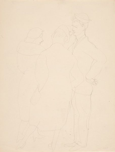 Editor: This is “Four Men Wearing Uniforms” by Max Beckmann, a pencil drawing. The figures are vaguely defined, sketchy. What strikes me is the repetitive, almost industrial process suggested by their similar attire and blank faces. How might we read this drawing in relation to the labor it depicts? Curator: Indeed. This is not just about portraiture; it's about the *making* of identity through the uniform, through social and industrial forces. Beckmann’s hasty strokes, the very process of applying pencil to paper, mimics the rapid and perhaps thoughtless creation of the modern military subject. Consider also, what does the inexpensive, readily available medium, pencil, tell us? Editor: Perhaps that this kind of regimentation, this mass-production of the military man, is commonplace, even disposable. Not rendered in valuable oil paint but something we can easily get. Curator: Precisely! And beyond its cheapness and disposable properties, look at how he applies pressure. It indicates Beckmann's experience of war and his deep understanding of its socio-economic dimensions. He depicts men dehumanized through production—their identities surrendered to a uniform, a process, a machine. Is this rendering efficient or emotional? Editor: It feels intentionally unemotional and critical, like he’s commenting on a bleak system that transforms men into objects, stripping away their individuality with quick, repetitive actions like the very ones he uses in drawing. It speaks volumes. Curator: Yes, consider the drawing then less a depiction of *men* and more of a commentary of how they have been forged from materiality and circumstance. It is almost as if the uniforms manufacture them. The pencil line is itself a method of socio-historical inquiry. Editor: That perspective has reshaped my understanding completely.