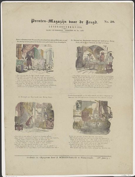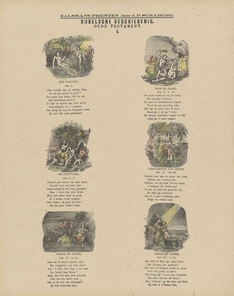 This is "Onderzoekt de schriften / Oude Testament," a print by Gerhardus Philippus Zalsman made in the 19th century. It presents us with six scenes from the Old Testament, each framed in its own vignette, like windows into biblical narratives. The scenes use a subdued palette, yet the artist's command of composition draws our eye through each miniature drama. Notice how Zalsman employs diagonal lines to create a sense of movement and tension. For example, the fiery destruction of Sodom uses bright yellows and oranges that starkly contrast against the blacks and grays. Zalsman uses each scene as a tableau vivant, freezing a moment that encapsulates a larger story. The arrangement of these scenes encourages comparison, inviting us to reflect on themes of creation, sin, and redemption. It is a structured meditation on scripture, revealing the artist's interpretation and the cultural values he sought to reinforce through visual storytelling.