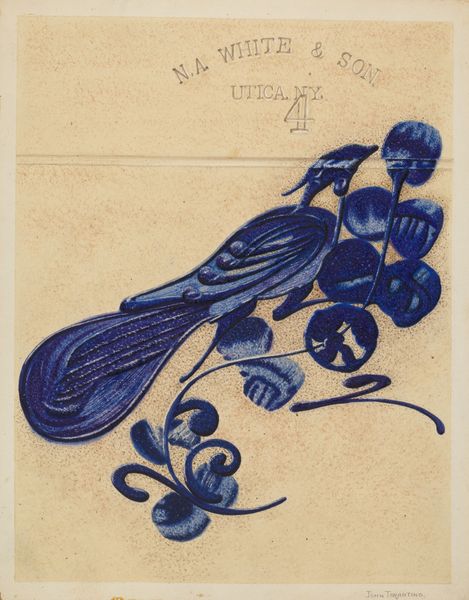 Editor: This watercolor and drawing piece, titled "Jar" by John Tarantino, dates from around 1937. I'm struck by its somewhat rough quality. The color palette is extremely limited and makes it hard to clearly define the bird as opposed to the plant or jar shapes surrounding it. What stands out to you about this artwork? Curator: Considering Tarantino’s “Jar” through a materialist lens draws attention to the production processes at play. The medium, watercolor and drawing, speaks to accessible and relatively inexpensive means. It’s less about rarefied oil painting and more about democratized art making. Look at how the artist is documenting J. & E. Norton's stoneware of Bennington, Vermont. This work suggests that these were created as drafts or models for mass reproduction rather than fine art objects intended for display in the bourgeois home. Does it seem as if there is a hierarchy being questioned in this piece? Editor: I think so! The artwork almost elevates everyday objects, maybe a celebration of design, production, or utility. I suppose the act of choosing that item and creating a study of its design speaks to how someone perceives what objects are considered beautiful or worthy of display in comparison to others. Curator: Exactly! How does the rendering, this very specific shade of blue against a muted background, contribute to your understanding? Do you think this detail contributes to the artwork and possibly the jar's commodification, or, instead, disrupts the concept? Editor: Interesting, it disrupts it slightly because it gives a folk or craftsy aesthetic. It suggests, again, a hand-made design rather than the streamlined perfection you might associate with a more polished brand. Curator: Precisely. Thinking about how these pieces exist highlights the artist’s contribution to commercial, everyday visual culture of the 1930s. I’m interested in the tensions the work sets up around the original jar, the mass reproduction of design, and the hand-crafted or utilitarian feel of this type of image production, all captured through the selection of its materials and medium. Editor: It gives me a lot to think about. Seeing it as a process rather than a finished, refined statement adds a whole new layer to my appreciation.