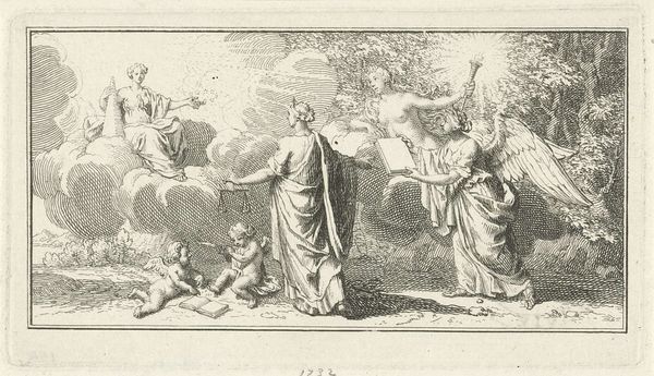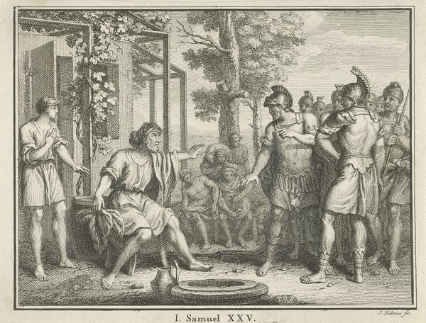 Curator: It has this almost storybook quality, wouldn't you say? Like a scene plucked from a rather serious fairy tale. Editor: This engraving, "H. Sebaldus van Neurenberg als kluizenaar," or "H. Sebaldus of Nuremberg as a hermit" by Jan van Londerseel, likely created sometime between 1580 and 1625, certainly does present a constructed narrative. What catches your eye specifically about its fairytale mood? Curator: It’s the almost theatrical arrangement of the figures within that wood. This group looks like a troupe of actors pausing mid-scene; Saint Sebaldus sermonizing while his former life observers the new. The setting feels both intimate and a bit performative. Like an epiphany, viewed by many. Editor: The visual construction reinforces societal norms and power dynamics. Consider the contrasting attire, for example. Saint Sebaldus is cloaked in relatively humble garb while those arranged around him wear clothing indicative of a wealthy ruling class. This could certainly play into contemporary understandings of class structure and, potentially, to underscore his choice of "giving up" those very structures to choose a more isolated and ostensibly moral life. The artist underscores Sebaldus' break with worldly status in embracing religious devotion. Curator: Absolutely. And yet, doesn’t he look almost…content? As though the weight of worldly matters is literally dropping off his shoulders? It suggests a sense of…joyous rebellion against constraint. Or, perhaps, as someone who spends a fair amount of time alone I may be merely projecting! Editor: And it could be seen from the alternative angle as being somewhat anti-social, pushing aside important members of society to venture down an alternative path alone, perhaps that also reveals other aspects of Jan van Londerseel's life at the time. Either way it makes for compelling considerations. Curator: A narrative, perfectly etched in time. That's fascinating! Editor: Yes, it leaves me with quite a lot to consider in how artists used history-painting and religious iconography. Thank you.