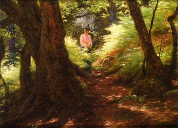 Editor: This is "Rosalind in the Forest" by Sir John Everett Millais, an oil painting, made *en plein air*. There's something quite staged about the composition though, despite its open-air creation. What’s your take? Curator: Well, let’s think about the material conditions that allowed Millais to even *attempt* this painting. Tube paints, readily available for the first time, were a key factor. Before, artists relied on workshop apprentices grinding pigments by hand. Now, they could focus on *application*. Notice the layers of paint and the brushwork, which highlight the industrial manufacture embedded within supposedly natural settings. Editor: I see what you mean! And that also impacts the depiction of Rosalind's clothes. You notice how richly colored and textured her outfit is compared to the backdrop. Curator: Precisely! Consider the labor that went into producing such fabrics – the spinning, weaving, and dyeing, the complex global trade networks. The painting becomes a showcase, not just of Rosalind, but of the wealth of material available. The production process is, in a sense, embedded in the very surface we observe. Editor: That's a great way to consider the role of wealth within the artwork itself. Is Millais almost making a commentary on that fact? Curator: The pre-Raphaelites were all about truth to nature, but that meant portraying the world, objects included, as commodities and items shaped by socio-economic circumstances. They're not just aesthetic things. Editor: I had never thought of plein air painting involving supply chains, but that makes so much sense now. Curator: Art doesn't emerge from thin air. Every brushstroke is informed by the political and social realities, reflected through paint, brushes, canvas and also the person depicted within the frame.