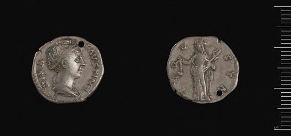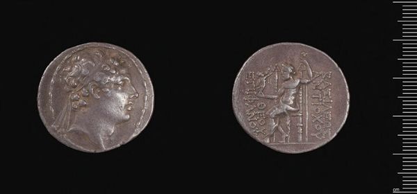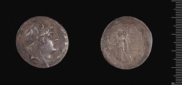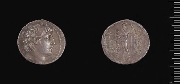 Curator: This is a tetradrachm, a silver coin, of Heliokles I, currently held at the Harvard Art Museums. Editor: The relief is quite striking, isn’t it? Even in this miniature scale, you can feel the weight of authority. Curator: Absolutely, and consider its function – currency! It's not just art; it facilitated trade, paid soldiers, and funded empires. The materiality of the silver itself speaks to power and wealth. Editor: Note how the artist, Heliokles himself, uses line and form to convey the king’s profile. The strong jaw, the regal diadem - it's all carefully composed for maximum impact. Curator: Exactly, each coin was a product of labor, reflecting social structures and economic realities. It’s a window into the workings of an ancient society. Editor: I find it remarkable how much expressive power is packed into such a small format. Curator: Indeed, a tiny object with a very large story to tell about labor and power. Editor: It offers a unique insight when we think about the artist's choices.