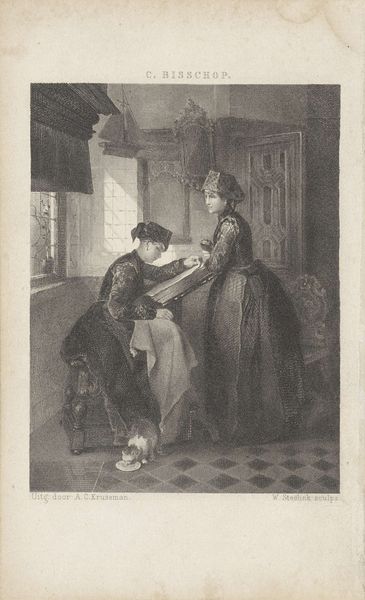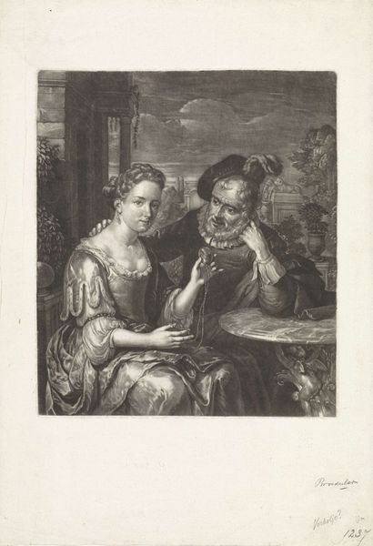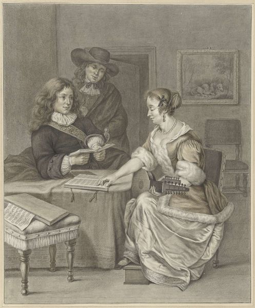 "Muziekles," or "Music Lesson," was etched by Jan Stolker in the 18th century. It captures a scene emblematic of the era’s complex social dynamics. The image depicts a woman, likely of the upper class, receiving musical instruction from a man. During this period, music was more than just an art form; it was a marker of social status and gender roles. The ability to play an instrument was a sought-after attribute for women, increasing their marriageability and reinforcing their position within the domestic sphere. However, the dynamic between teacher and student hints at the power dynamics inherent in these relationships. The woman's focus on her instrument contrasts with the man's controlling gesture, suggesting a subtle negotiation of power. Stolker's print invites us to consider the intersections of gender, class, and artistic expression in the 18th century, prompting questions about the agency and representation of women within these contexts.