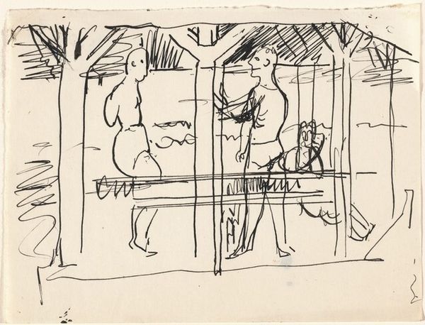 Mark Rothko made this pen and ink drawing, Two Figures Standing Underneath a Shelter, on paper, likely in the 1930s or 40s. It shows a simple shelter with two figures standing beneath. Rothko, a Jewish immigrant from Russia, came of age in the United States during the Great Depression. Art of this time was often socially engaged and this work may reflect that, but without a specific date, it is hard to make definitive claims. The shelter could be a bus stop, a beach cabana, or even a breadline. During the 1930s, in particular, the theme of the alienated individual became common, reflecting societal anxieties about economic hardship and social displacement. The image’s open-ended meaning reflects Rothko’s own ambivalence about institutions and the social order. Further research into the artist's life and the cultural context of the era would help us better understand the intended meaning of the drawing. Rothko’s personal writings, period newspapers, and government documents would provide valuable insights into the social and political landscape that shaped this work.
