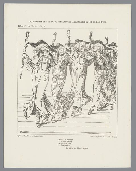 Curator: What a fascinating image. This print, titled "Spotprent op de verkiezingen in juni, 1883," a lithograph in ink by Johan Michaël Schmidt Crans, really captures a moment in time. What strikes you about it? Editor: It seems like a chaotic yet organized political rally. Everyone's holding signs, and there's a real sense of... urgency, maybe? What do you see in it? Curator: The signs themselves are crucial. They're not just banners; they’re embodiments of the cultural anxieties and aspirations circulating at the time. For instance, we see figures carrying signs referencing "Living God", juxtaposed against phrases like “Revision of the Constitution”. Notice how religion, governance and social issues intertwine? It seems to suggest the conflicting ideologies clashing in the June elections. Editor: So the artist is using these symbols to make a larger comment on the election? Curator: Exactly! Caricature as a medium can amplify social commentary; notice the exaggerated features of some figures, adding a layer of satirical critique. Even the placement of the "Stembus", or ballot box, elevated in the background—is it truly accessible to all? The artist plays with cultural memory here, invoking shared knowledge to fuel a pointed perspective on the electoral landscape. How do the groupings of people influence the meaning of the scene for you? Editor: It highlights the different factions and maybe the tension between them, as if the future of the nation is hanging in the balance. I see how these visual elements can reveal more profound ideas about culture and history. Curator: And through that, the enduring power of symbols and how they evolve over time. It's a powerful example of art reflecting cultural consciousness. Editor: Absolutely. Now, when I look at this image, I see it less as just a historical document, and more as a testament to our current, ongoing debates about ideology and society. Thank you for your insight.