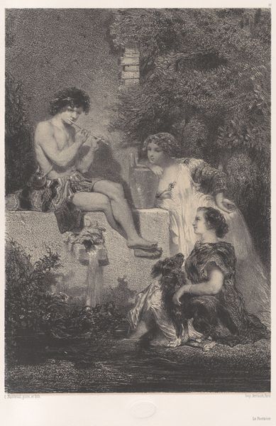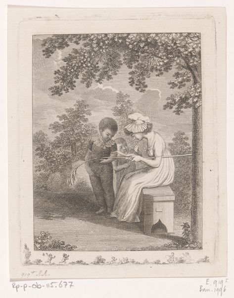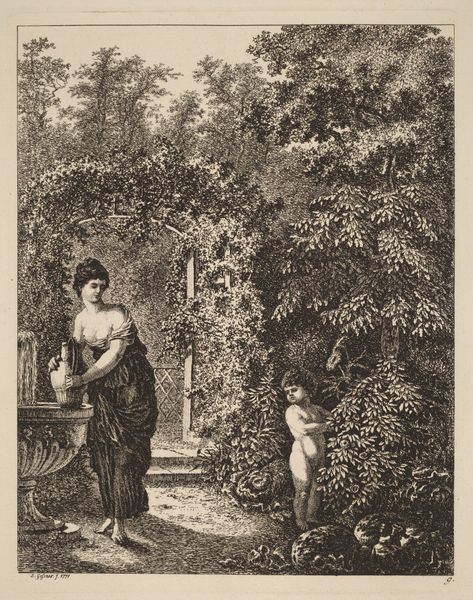 This illustration of a couple on a bench in a garden was made by Georg Christian Schule, using an engraving technique. Think of it as a very precise form of carving. The artist would have used a tool called a burin to incise lines into a metal plate, likely copper. The density of the lines creates the tones we see, from the light sky to the dark foliage. This was a highly skilled process, demanding years of training. Engraving was essential for mass communication before photography, allowing images to be reproduced in books and newspapers. The rise of printmaking was closely linked to the growth of commerce and the spread of ideas. It allowed artists like Schule to reach a wider audience, beyond the traditional realms of painting and sculpture. So, next time you see an engraving, remember the labor and skill involved, and its important role in shaping modern society.