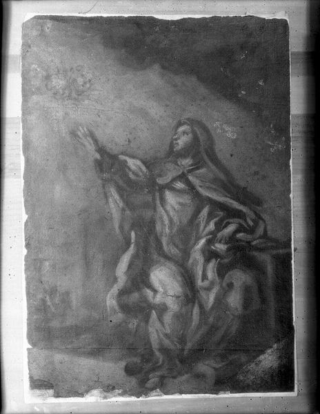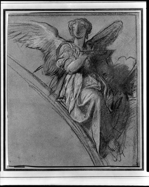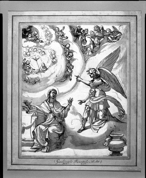 Curator: Mariette Lydis’s “The Annunciation” presents a classic scene in monochrome. The figures emerge ethereally from a textured wash. Editor: It's striking how this image subverts traditional depictions. The androgynous angel and Mary's weary posture challenge patriarchal narratives. Curator: Observe the composition: the dynamic diagonals of the angel's form against the more static verticality of Mary. Editor: The lack of vibrant color amplifies the sense of solemnity. The grayscale palette underscores the socio-political weight of the moment. Curator: The artist is playing with tonal values, creating depth and contrast within a limited palette. Editor: The softness of the medium contrasts with the powerful message it conveys. It reframes the Annunciation from a woman's perspective. Curator: Indeed, a thoughtful work, technically skillful in its subtle gradations. Editor: Precisely, it invites us to consider the intersections of gender, power, and faith.