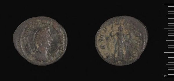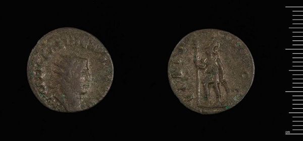 Curator: Here we have an Antoninianus of Valerian I, residing here at the Harvard Art Museums. Editor: Oh, I am immediately struck by the small scale of this object. It feels heavy with history despite its humble size. Curator: Absolutely. It's incredible to think of the power this tiny coin once held. On one side, we see a bust of Valerian wearing a radiate crown, and the other depicts a scene I believe represents the emperor's military virtue. Editor: The figure on the reverse seems to be holding a spear or a scepter, which speaks to authority and power, but it's also interesting how worn down the coin is; like its story has been softened by time. Curator: Indeed, its age is part of its allure; a tangible link to the past. Editor: There's a certain melancholy to seeing something so faded, a reminder of the impermanence of power and empires, even those once considered invincible. Curator: A poignant observation, really, that even symbols of emperors can become worn whispers through time.