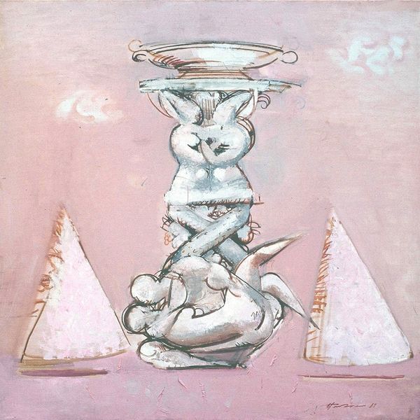 Vasiliy Ryabchenko’s "Fountain constructing (blue)" is a painting, and it feels like Ryabchenko is finding his way as he goes. It's like the painting is growing, not just being made. The surface has a kind of chalky texture, and the colors are muted, almost as if seen through a mist. Look at the way the figures are outlined, not with sharp lines, but with softer edges that suggest movement and change. The gestures are fluid, like the figures are caught mid-dance, or perhaps mid-transformation. Notice the dolphins near the bottom, they’re not just decoration; they seem to be part of the fountain's structure. Their simple representation is almost childlike. I’m reminded of Picasso, not in terms of style, but in the sense of playful invention, that art is a field of possibility, where representation and abstraction can coexist, allowing for ambiguity and multiple meanings to emerge.