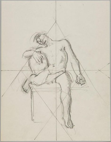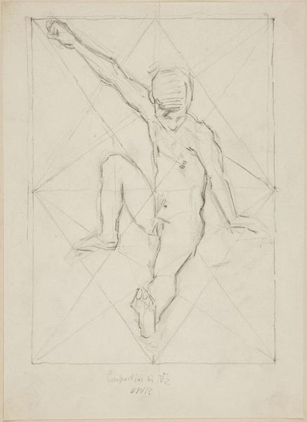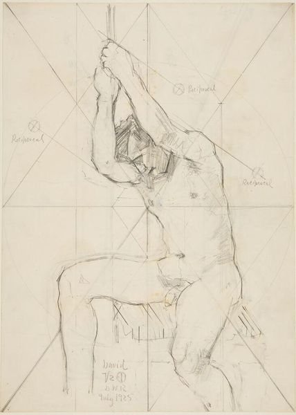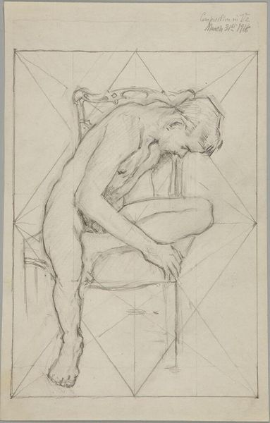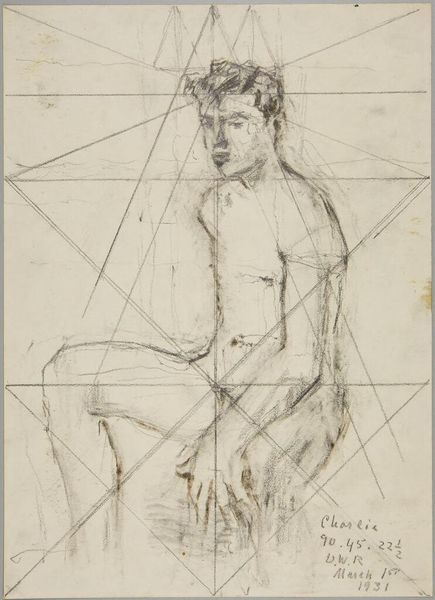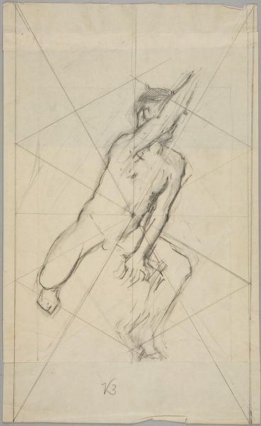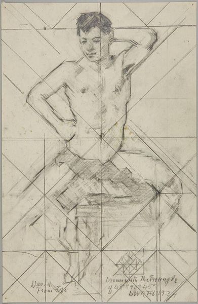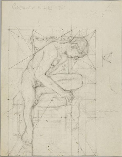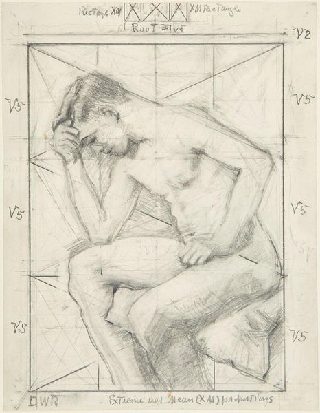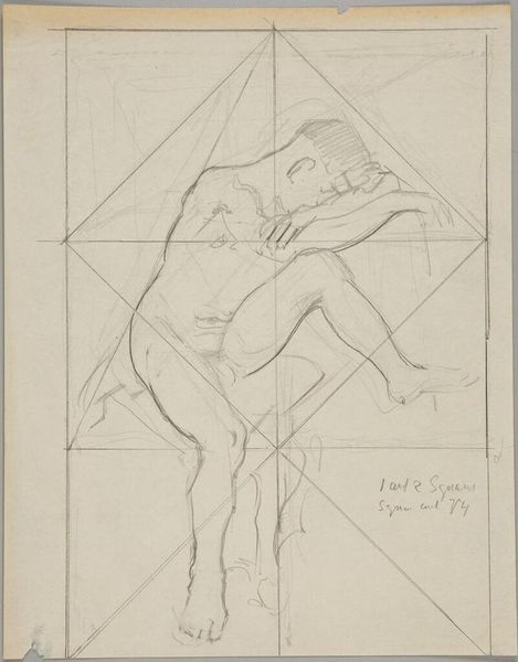 Curator: Before us is Denman Waldo Ross’s “Male Nude Resting Head on Left Arm,” currently held at the Harvard Art Museums. The drawing presents a reclining male figure. Editor: It feels immediate, almost like a study. The pencil lines are so exposed, and that grid overlaid on top is quite striking. Curator: The grid points toward Ross's interest in systems of design and teaching art, particularly his theories on color and composition which he believed could be systematized and taught. Editor: And the way the nude is rendered, it’s not idealized. You see the weight of the body, the pressure on the arm. It speaks to the labor of being. Curator: Precisely, it's an interesting negotiation between academic life drawing and something more personal. Editor: The visible process is really captivating. It challenges conventional notions of artistic skill by emphasizing the physical act of drawing. Curator: It certainly pushes us to consider the intellectual and the physical aspects of creating art. Editor: It’s a fascinating piece to consider within the framework of material studies, particularly when thinking about the historical context of art education. Curator: Indeed, considering Ross's role in shaping artistic tastes at Harvard, this drawing offers a glimpse into the foundations of his pedagogical approach.