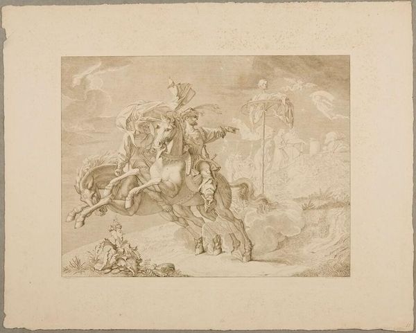 Curator: So, here we have Ferdinand Ruscheweyh’s “Faust on the Blocksberg,” currently residing at the Harvard Art Museums. Editor: It feels ethereal and unsettling; the figures seem to emerge from the paper itself. Curator: Indeed, the sepia wash contributes to that ghostly effect. Ruscheweyh captured a scene from Goethe's Faust, a night of revelry and magic on the Blocksberg mountain. Note the balance between the figures and the radiating light. Editor: Yes, and the layering of light and shadow. What do you think is the purpose of this ethereal light? Is it meant to convey spiritual ascension or the madness of that night? Curator: Perhaps both. It is a study in contrasts; the solid forms of Faust and Mephistopheles juxtaposed against the swirling, spectral figures above. Editor: This interplay truly captures the struggle between the material and spiritual realms that's central to Faust. It's a reminder that even in darkness, there’s a strange sort of illumination.