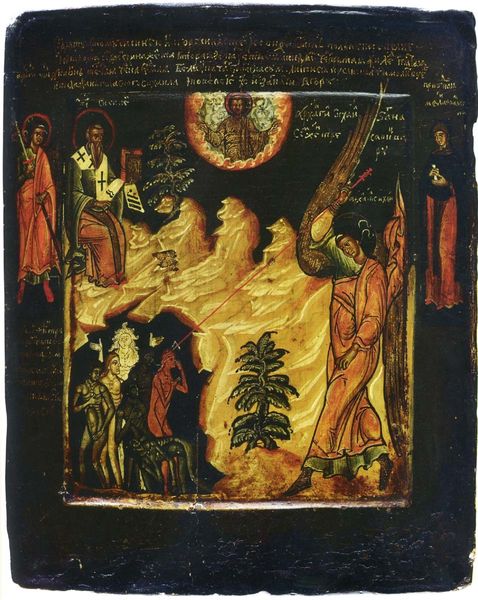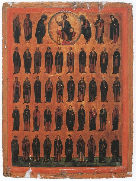 Editor: This is "Sophia, Holy Wisdom," a tempera painting from 1625. There is so much happening, but I’m struck by how the figures at the bottom seem almost trampled upon while those above are bathed in light. What do you see in this piece? Curator: I see a complex intersection of power, theology, and societal hierarchy. This icon, typical of Byzantine art, presents Sophia, divine Wisdom, as central authority, yet that authority is built upon a subjugated populace at the bottom. Consider the use of light – who is illuminated, and who remains in shadow? This deliberate visual choice reinforces existing power structures of the time, specifically religious power dynamics and social inequality. What stories do you think those figures at the bottom might tell if they had a voice? Editor: That’s a compelling point. I hadn’t really considered the positioning as a deliberate commentary on power dynamics. So the light emphasizes the justification of existing power? Curator: Precisely. The halos and rich garments denote sanctity and authority, visually legitimizing the status quo. However, thinking critically, how might feminist theology challenge this representation of Sophia, typically feminized in Orthodox thought? Editor: Well, if Sophia is supposed to embody wisdom, and wisdom should be inclusive, this image seems to fall short by visually excluding and marginalizing certain people. It sort of seems at odds with its purported message. Curator: Exactly. By examining art through a critical lens – questioning whose stories are told and whose are silenced – we gain a deeper understanding of both the artwork and the society that created it. Editor: It’s fascinating to consider how even devotional art can reinforce social hierarchies. I am walking away having more questions about light, authority, and power than answers. Curator: And isn’t that the point? Art should provoke these questions.