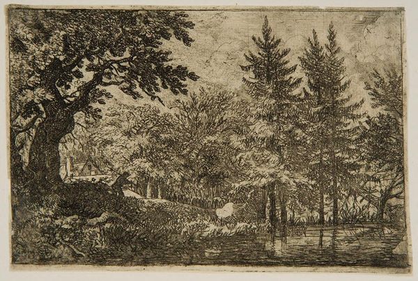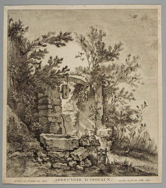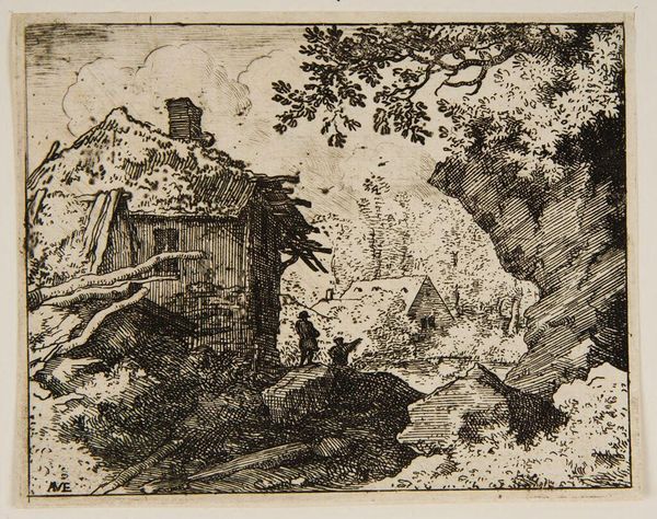 Curator: Aegidius Sadeler II, born in 1568, created this intricate engraving entitled "Three Men Drinking." What strikes you initially? Editor: The density! The composition feels incredibly compact, a tapestry of textures rendered in stark contrasts. Curator: Indeed, Sadeler masterfully uses line to create depth and shadow. But consider the social context; drinking scenes often served as moralizing tales, cautionary warnings against excess, reflecting societal anxieties. Editor: Perhaps, but I see a pure exploration of form. The way the lines build the textures of the bark, the cascading water, it’s mesmerizing in its detail. Curator: Yet, isn't the choice of subject matter significant? These men, likely from the lower classes, are depicted in a moment of leisure, hinting at a critique of social inequalities. Editor: I see it more as a study of light and shadow, transforming mundane reality into something sublime. Curator: Ultimately, it's a dialogue between form and content, inviting us to question both the artist's intentions and our own interpretations. Editor: A perfect tension, leaving us pondering the surface and its depths.