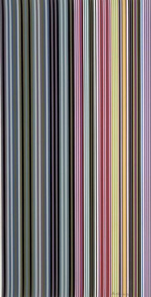 Editor: This is Bridget Riley's "Ra 2," a vibrant print of vertical stripes. I'm struck by its cool color palette. What’s your take on how Riley uses color and form in this work? Curator: Look at the materiality. The flatness of the printmaking process is key. Riley democratizes art, moving away from traditional painting's emphasis on the artist's touch. The repetitive stripes also speak to industrial production. Consider the social context: how does mass production influence our perception and consumption of art? Editor: So, you're saying the *making* of the art is as important as the art itself? Curator: Exactly. It makes us question what constitutes "art" when the artist's hand is less apparent. Editor: That’s a completely new way to appreciate it for me. Thanks!