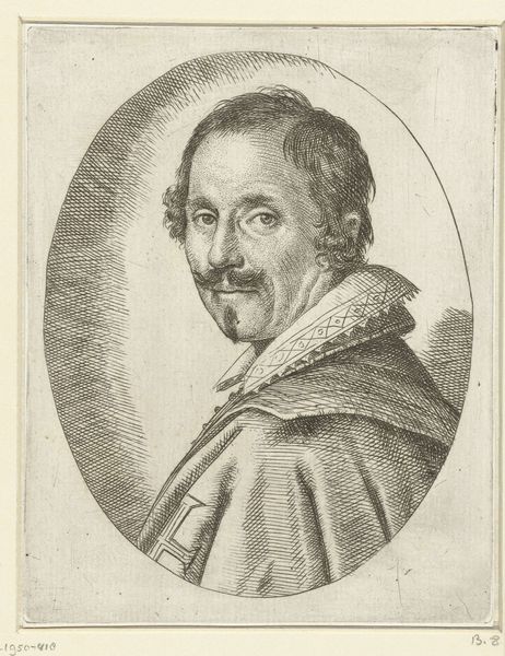 Ottavio Leoni created this self-portrait using engraving techniques. The octagonal frame establishes a structured boundary, contrasting with the softness of Leoni's features and hair. The fine lines and stippling create tonal variations that define the form, guiding our eyes across the composition. The artist's gaze meets ours directly, engaging us in a silent dialogue. He emphasizes the importance of form and structure while subtly conveying a sense of self-awareness. This carefully constructed image is not just a representation of the artist, but also a statement about the nature of identity and representation itself. The cross on his attire, set against the textured background, further emphasizes the interplay between form and meaning. Leoni's use of engraving allows for precise control, transforming a personal image into a study of line, texture, and the semiotics of portraiture.