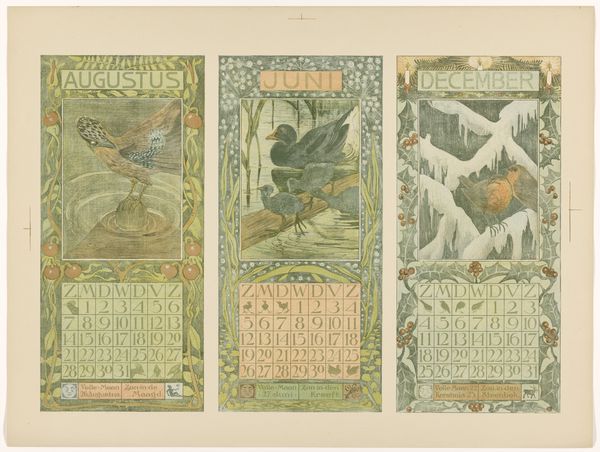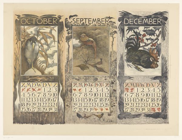 These calendars for October, November, and September 1904 were designed by Theo van Hoytema, who had a profound interest in ornithology and socialism. As a critique of industrialization, Hoytema embraced the stylized forms of Art Nouveau, drawing inspiration from the natural world. Look at the birds, leaves, and other decorative elements that surround the calendar dates. The natural world in the calendar connects to notions of time, change, and the cyclical rhythm of life. Hoytema lived during a period of significant social and political change in the Netherlands, including the rise of socialist and anarchist movements. His political beliefs are subtly woven into his art through symbolism, which reflects his vision for a more equitable society. As you observe the details of the calendar, consider how the artwork captures both the beauty of nature and the aspirations for a more just world, revealing the artist's deep connection to the social and environmental concerns of his time.